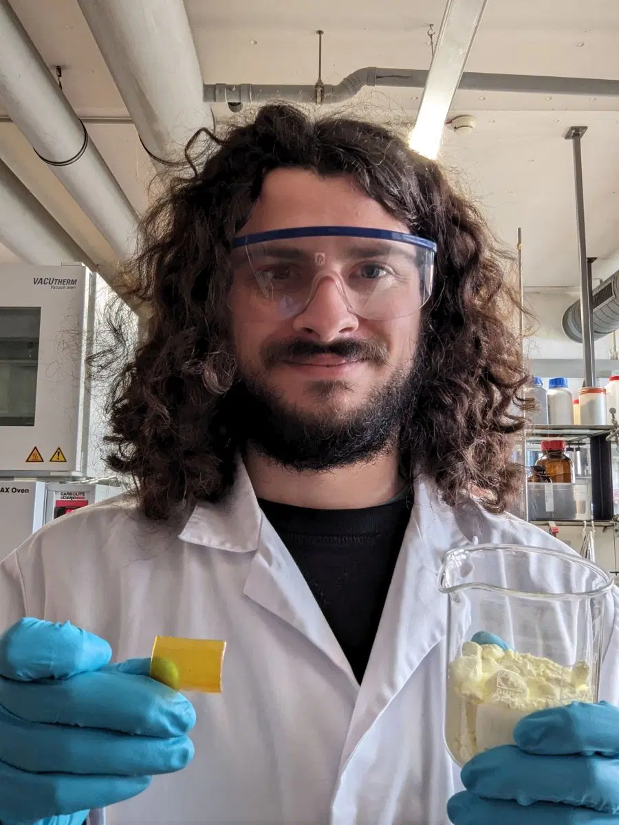 © Universität Bayreuth | Cesare Gallizioli, Doktorand bei Prof. Dr. Alex Plajer, zeigt den Schwefel, mit dem im Bayreuther Labor gearbeitet wird.