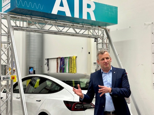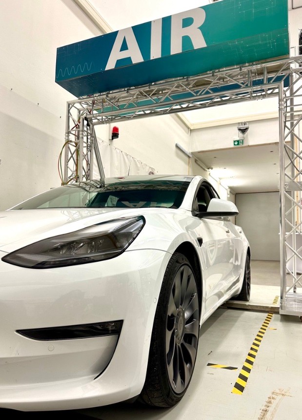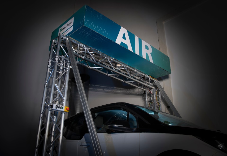 © Fraunhofer IIS/Christina Müller | Der Messaufbau des AIR-Röntgensystems erinnert an eine klassische Waschanlage: Die über dem Fahrzeug positionierte Röntgenquelle emittiert einen feinen Röntgenstrahl, der das Fahrzeug einschließlich der Batterie passiert und von einem am Boden positionierten Detektor aufgefangen und verarbeitet wird.