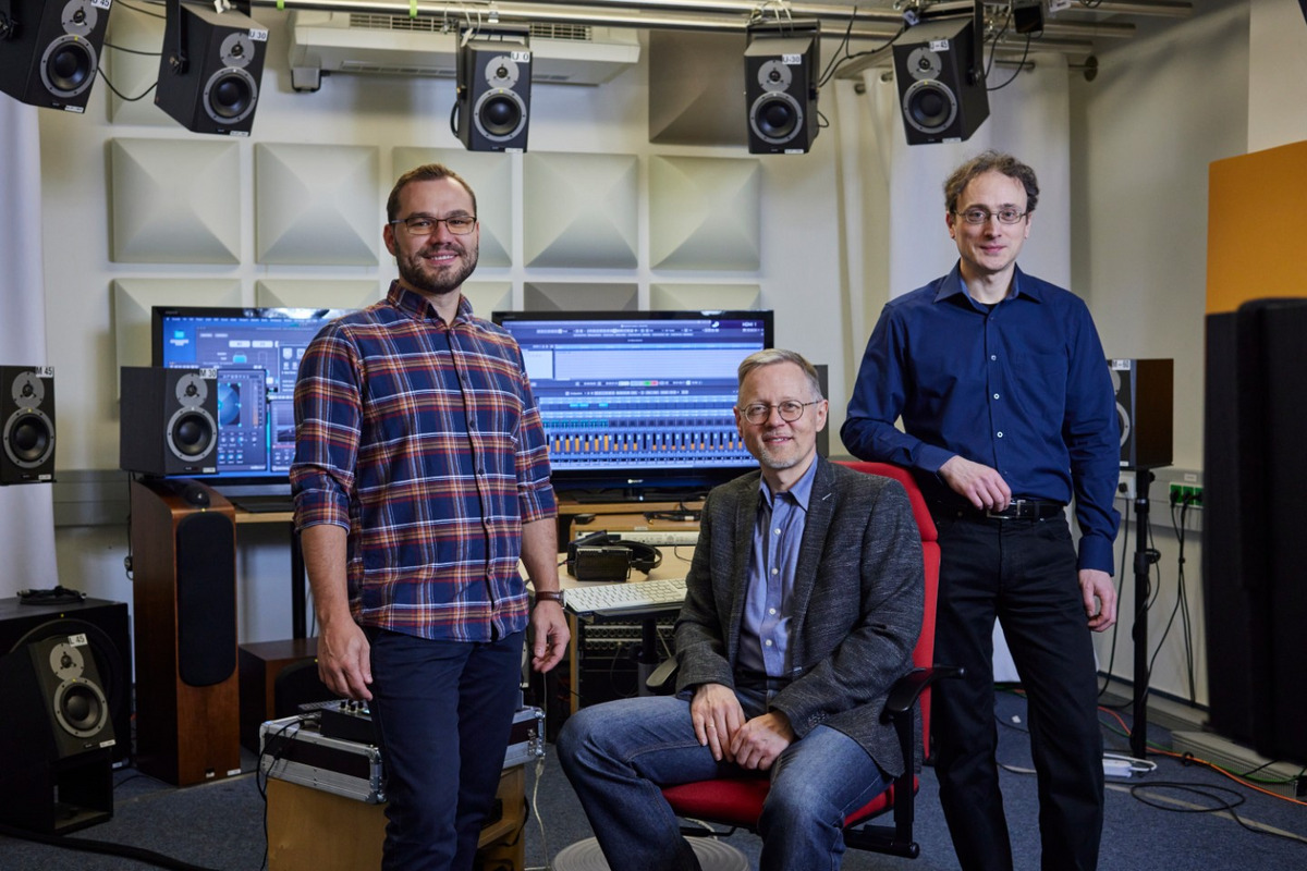 © Fraunhofer / Piotr Banczerowski | Das Forscherteam im Studio: Adrian Murtaza, Harald Fuchs und Dr. Achim Kuntz vom Fraunhofer IIS (v.l.n.r.)