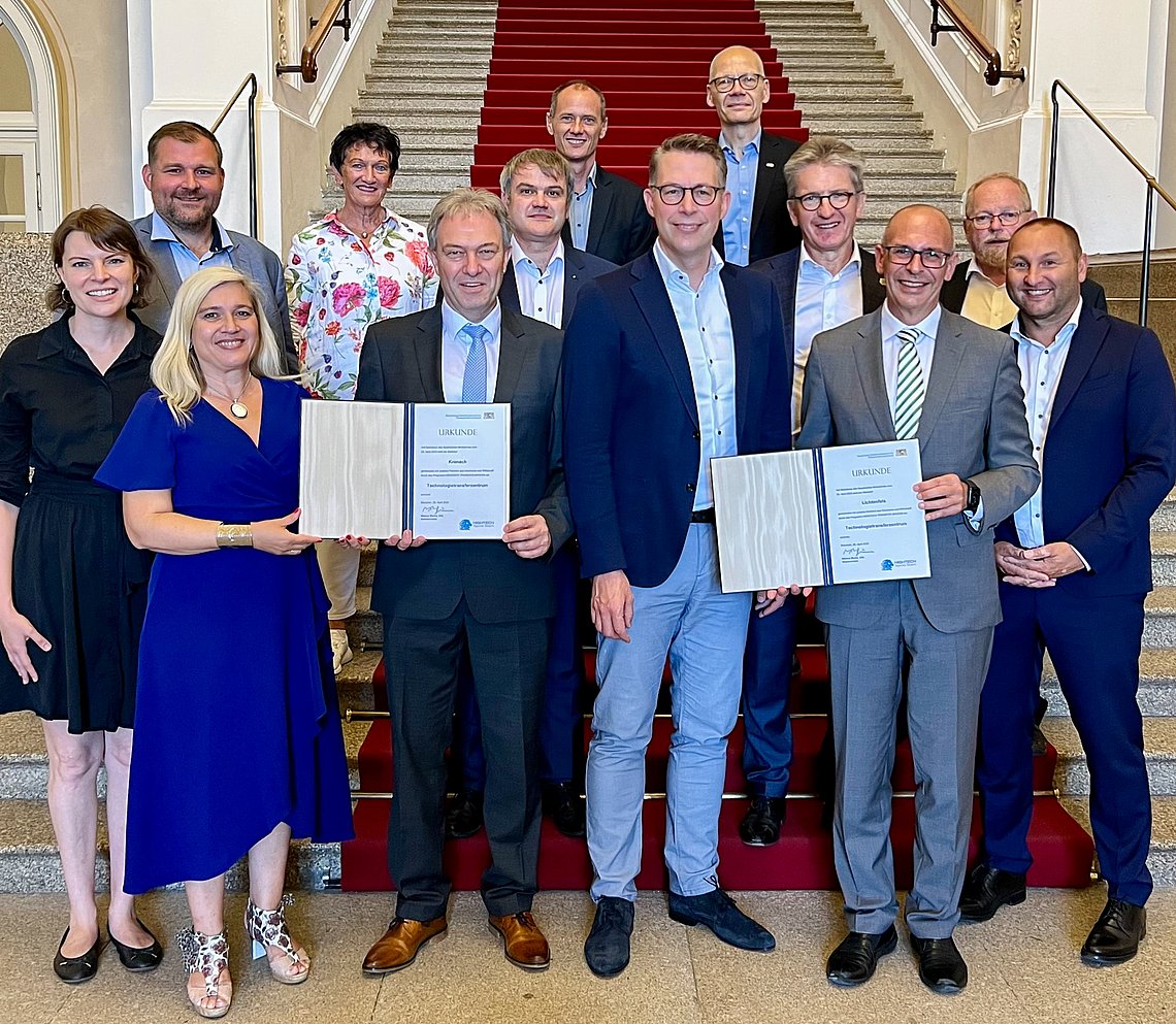 © Bayerisches Staatsministerium für Wissenschaft und Kunst | Bayerns Wirtschaftsminister Markus Blume (Mitte) überreicht die Urkunden an die Ohm und die Hochschule Corburg.
