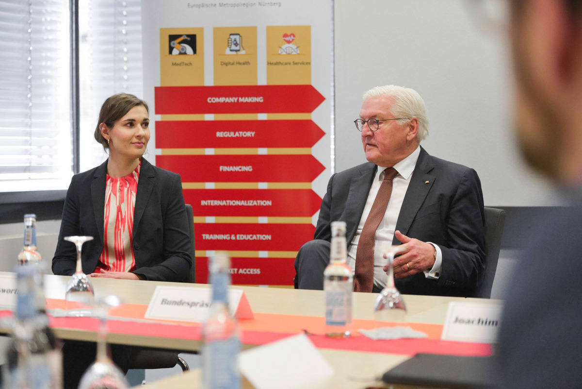 Wie kann eine erfolgreiche Transformation im Gesundheitswesen realisiert werden und was macht ihn aus, den gelingenden Wandel? Mit diesen Fragen reiste Bundespräsident Steinmeier nach Erlangen zum Medical Valley EMN e. V., um sich vor Ort von Startups, KMU und Forschungsteams informieren zu lassen und konkret mit ihnen in den Austausch zu gehen. Die präsentierten Innovationen boten hierfür die perfekten Voraussetzungen und bewiesen die enorme Vielfältigkeit der in der Region ansässigen Unternehmen.