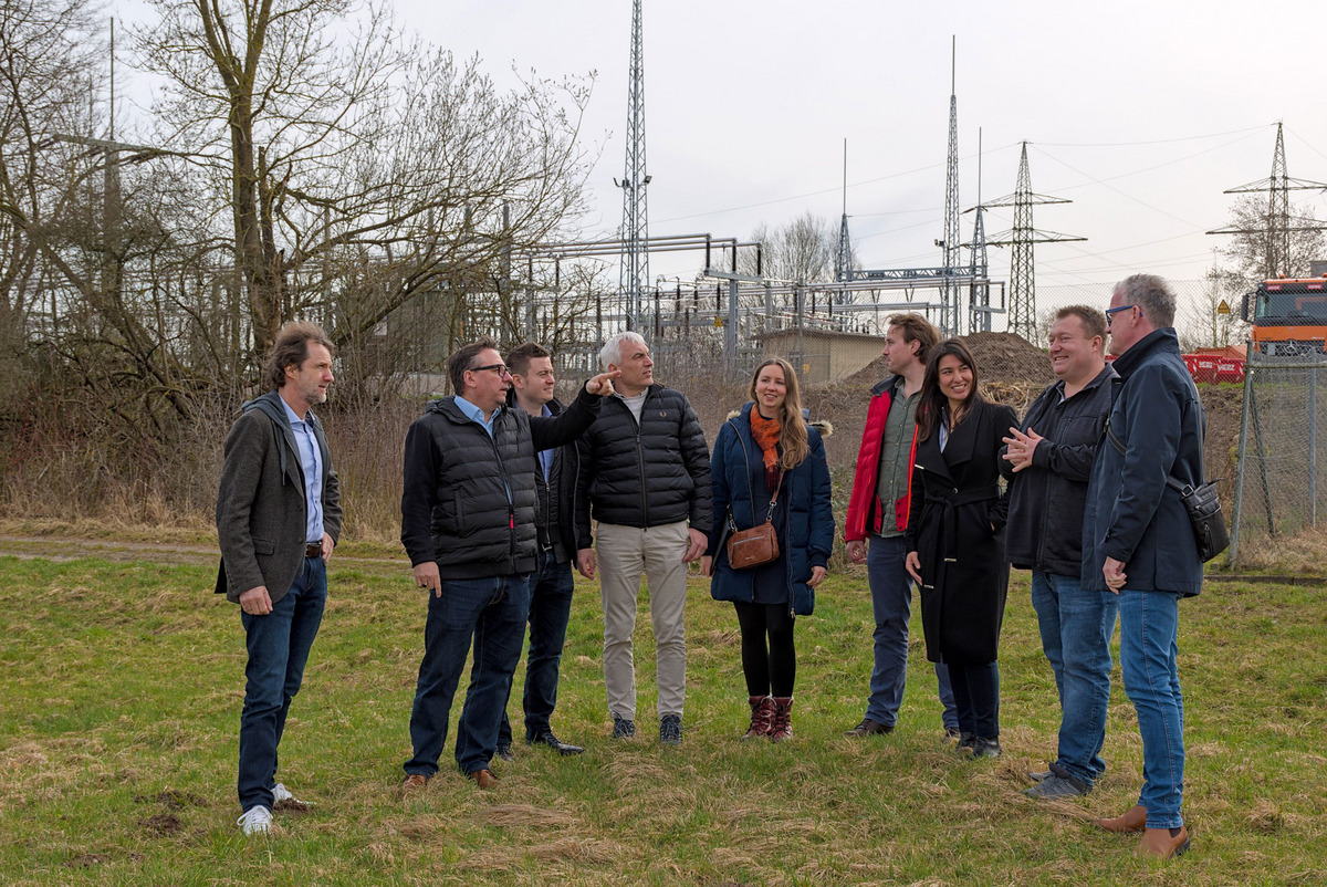 Das Projektteam für den neuen Batteriespeicher in Feuchtwangen traf sich am künftigen Standort nahe der Dinkelsbühler Straße in Feuchtwangen. v.l. Dr. Rainer Saliger, Projektentwicklung Siemens, Lothar Beckler, Technischer Leiter der Stadtwerke Feuchtwangen und Geschäftsführer nahKRAFT GmbH & Co. KG, Matthias Hammerl, Siemens Vertriebsingenieur, Armin Siegritz, Gesamtprojektleitung Siemens, Sabina Olbrich Energieingenieurin, Siemens, Clemens Schwarzenbacher, Energieingenieur Siemens, Sheila Pöffel, kaufmännische Projektleitung Siemens, Alexander Strauß, Stadtwerke Feuchtwangen sowie Patrick Ruh, erster Bürgermeister der Stadt Feuchtwangen. (Bildrechte: Stadt Feuchtwangen/Rebecca Weber)