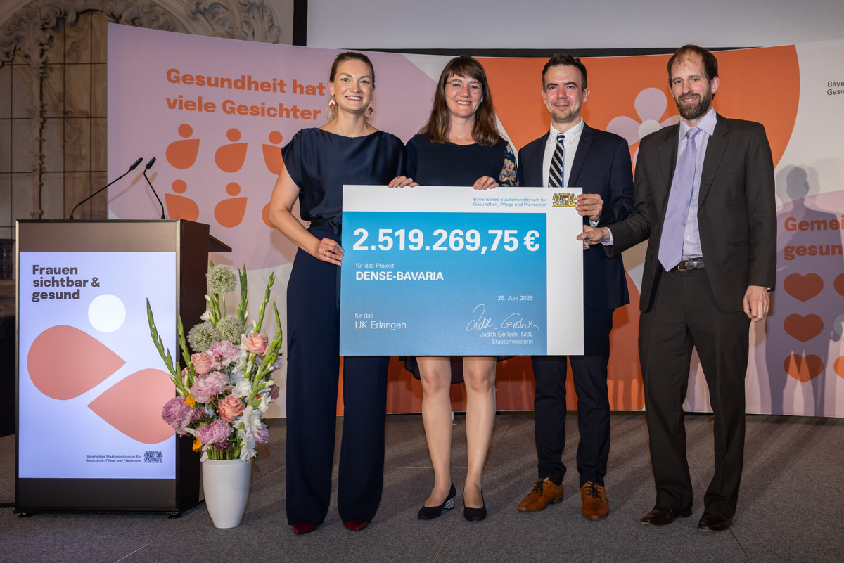 DENSE-BAVARIA ist eine Studie des Radiologischen Instituts, Uniklinikum Erlangen, (Direktor: Prof. Dr. med. Michael Uder) und widmet sich der Früherkennung von Brustkrebs und Erkrankungen des zentralen Herz-Kreislauf-Systems bei Frauen mit dichtem bzw. sehr dichtem Brustdrüsengewebe. Das Forschungsprojekt wird im Rahmen des Bayerischen Förderprogramms "Frauengesundheit und KI" vom Bayerischen Staatsministerium für Gesundheit, Pflege und Prävention gefördert.