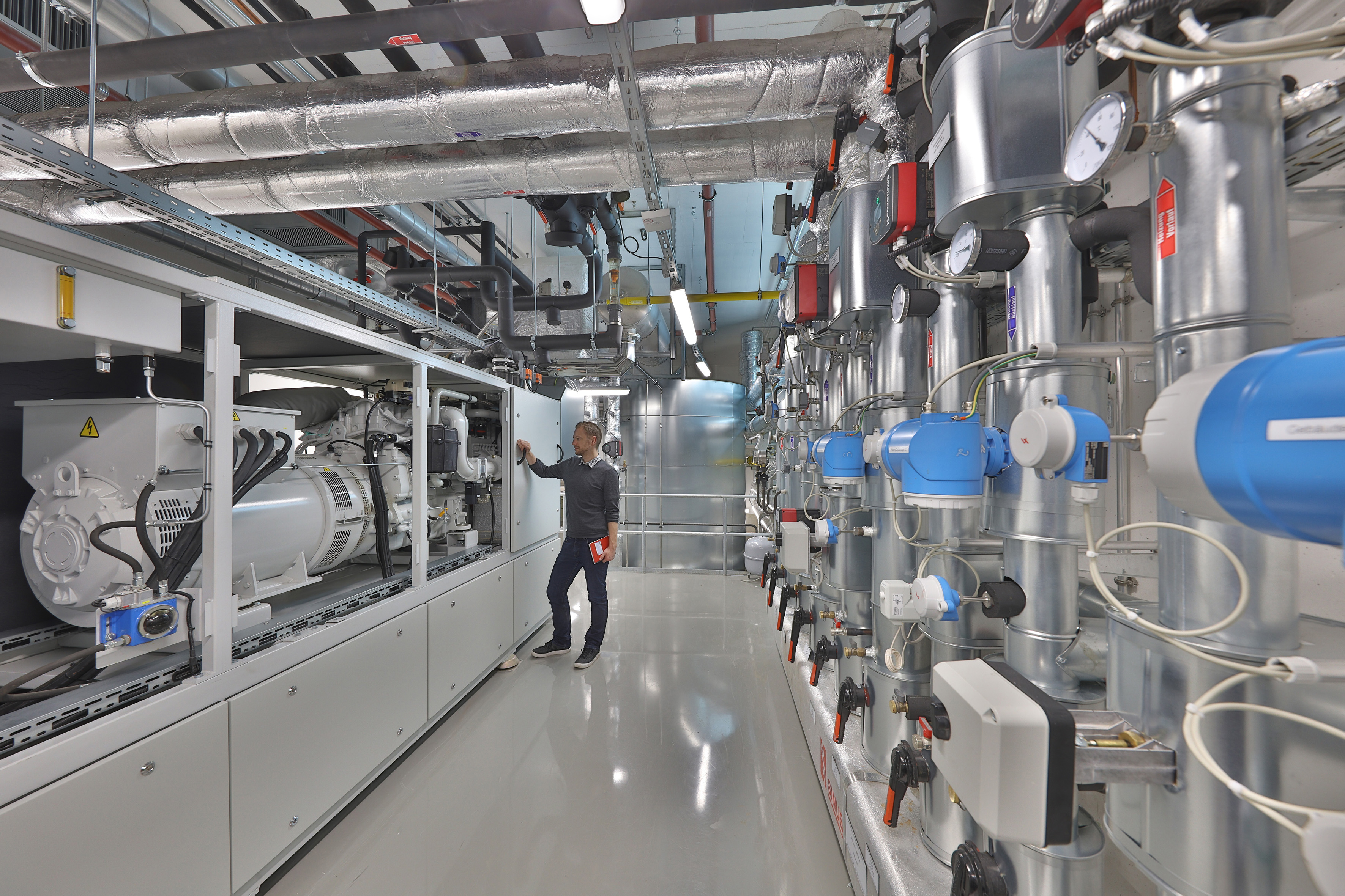 Blockheizkraftwerk und Warmwasserspeicher im energietechnischen Reallabor des Fraunhofer IISB. Bild: Kurt Fuchs / Fraunhofer IISB