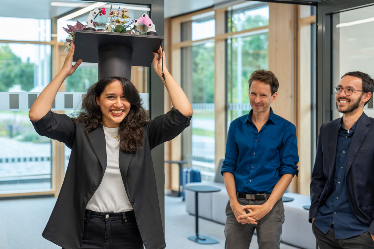 © UTN/Tobias Rühl | Nach der erfolgreichen Verteidigung wird Dr. Mirjalili von ihrer Forschungsgruppe mit einem selbstgebastelten Doktorhut geehrt.