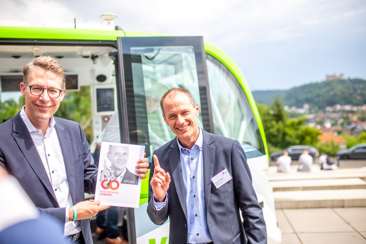 Coburgs Oberbürgermeister Dominik Sauerteig machte bereits in der Eröffnung des Wissenschaftstags deutlich, dass das Thema „Transformation zur Nachhaltigkeit“ hier gut aufgehoben ist: „Wir tun Vieles, um uns hier vor Ort zukunftsträchtig aufzustellen und auch resilient in die Zukunft zu gehen. In all diese Change-Prozesse versuchen wir den Gedanken einer nachhaltigen Stadt- bzw. Regionalentwicklung mitzudenken und mit einzubauen.“ Bei der Innovationsstrategie im Coburger Land sei dabei die Hochschule Coburg ein zentraler Partner und eine „Ideenschmiede“, von der die Region profitiere – so wie alle Regionen der Metropolregion von dem Netz aus wissenschaftlichen Einrichtungen profitieren, die beim Wissenschaftstag zusammenkommen. Von den innovativen Ideen der Gastgeberregion konnten sich auch die Besucher-Innen des Wissenschaftstags bei ihrer Anreise überzeugen: „Unsere Gäste erhalten mit der Fahrt in einem autonom fahrenden Shuttle gleich einen intensiven Eindruck von der Innovationskraft unserer Region,“ sagte Prof. Dr. Stefan Gast, Präsident der Hochschule Coburg.