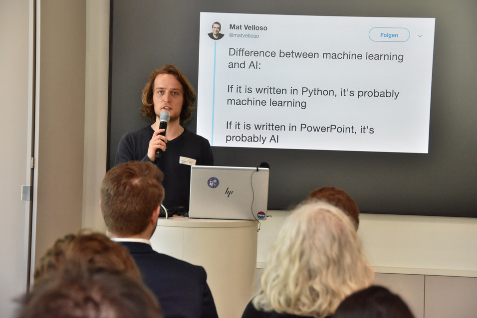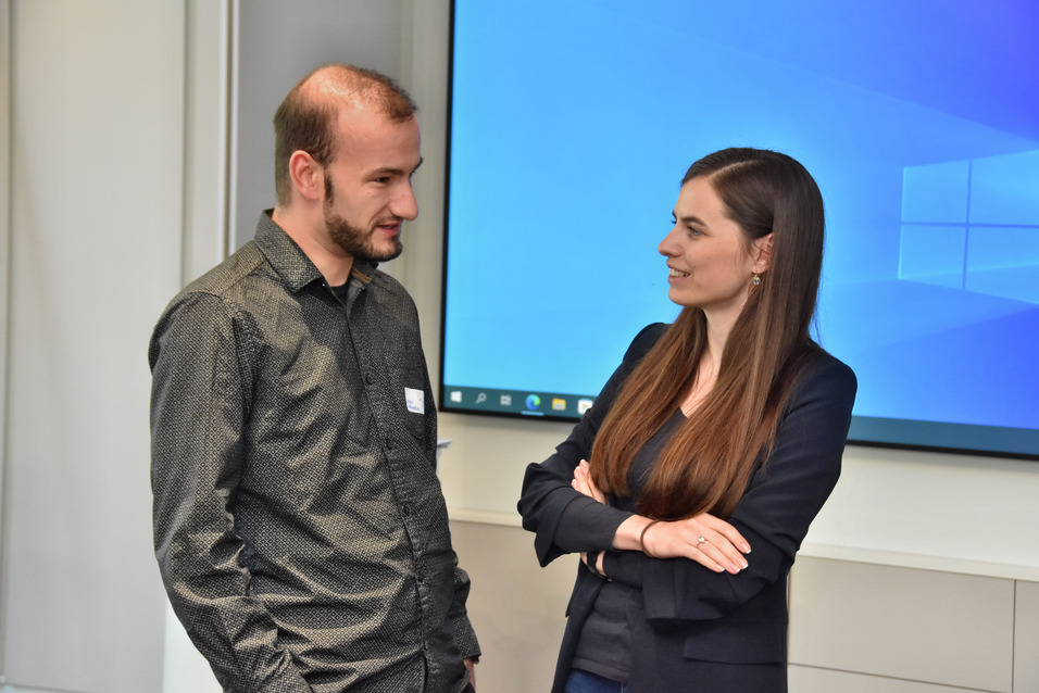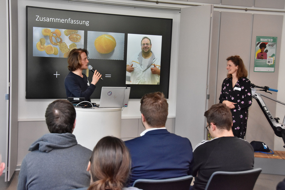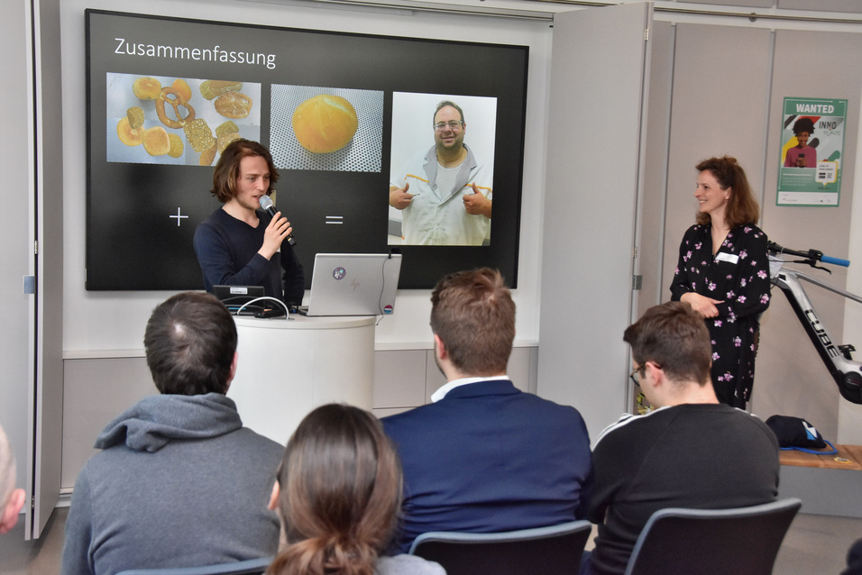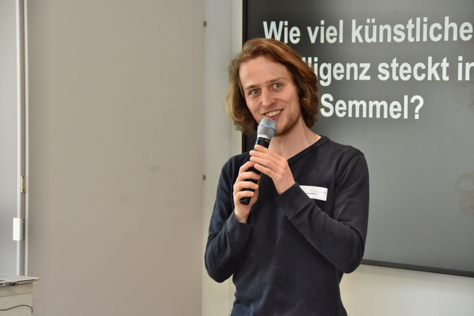 Eine Challenge aus der App stellten Maximilian Bundscherer und Thomas Schmitt, wissenschaftliche Mitarbeiter am KIZ der TH Nürnberg, vor. Im Kurzvortrag „Wieviel Künstliche Intelligenz steckt in einer Semmel?“ im Stil eines Science Slam zeigten sie eine überraschende Anwendung von KI: Mithilfe der Technologie passt eine Bäckerei aus dem Raum Kronach ihre Produktion an und spart Ressourcen.