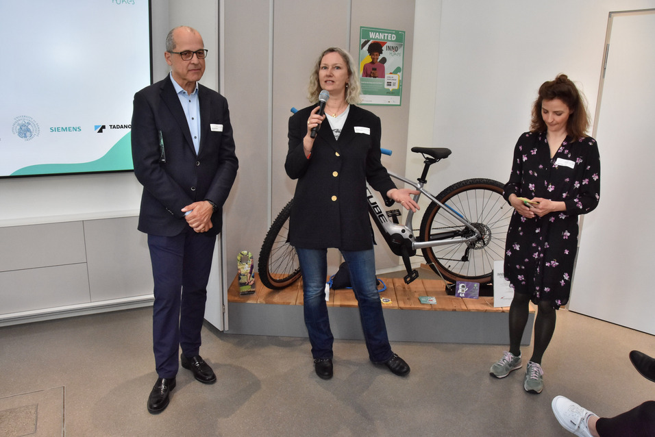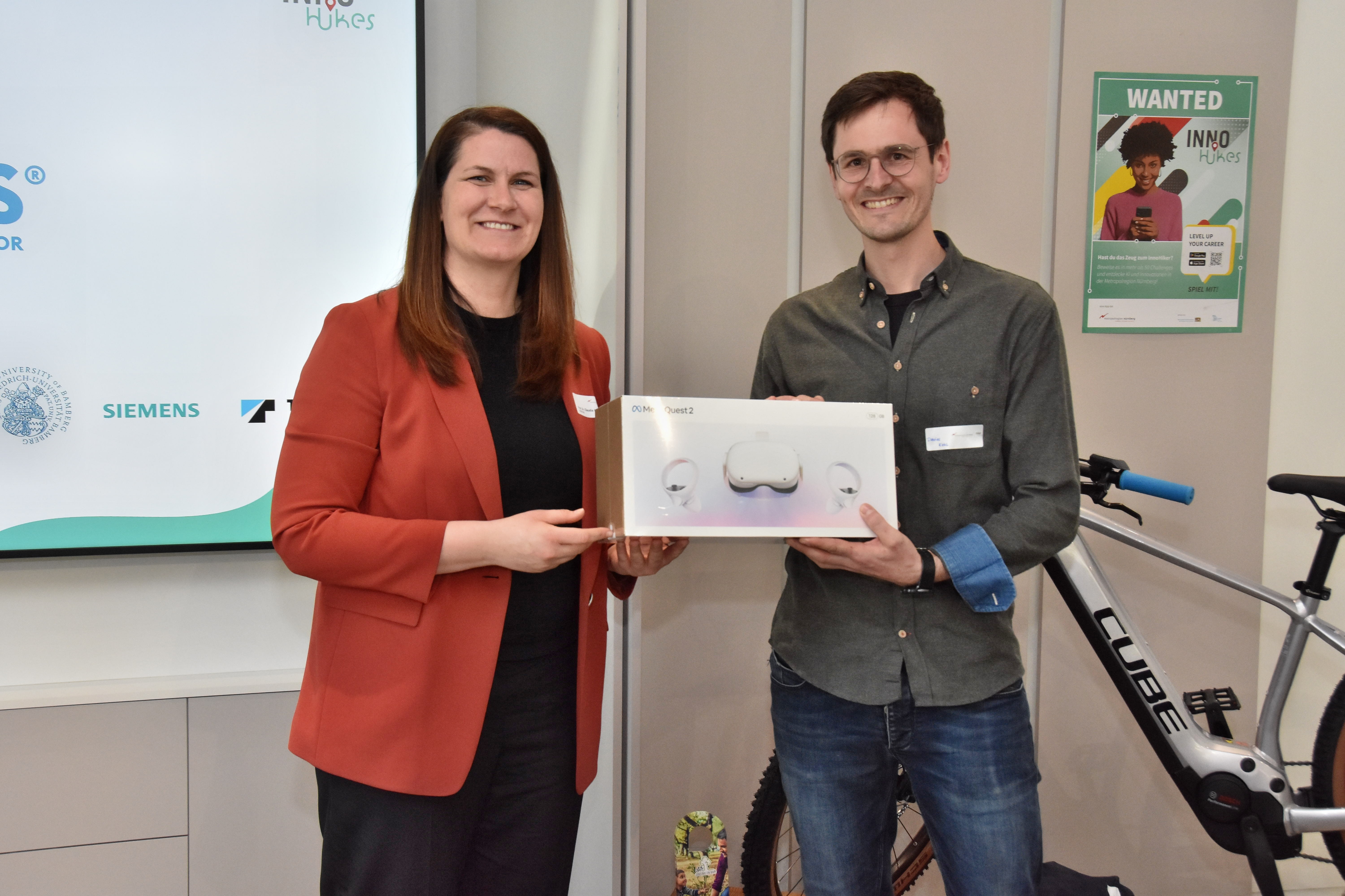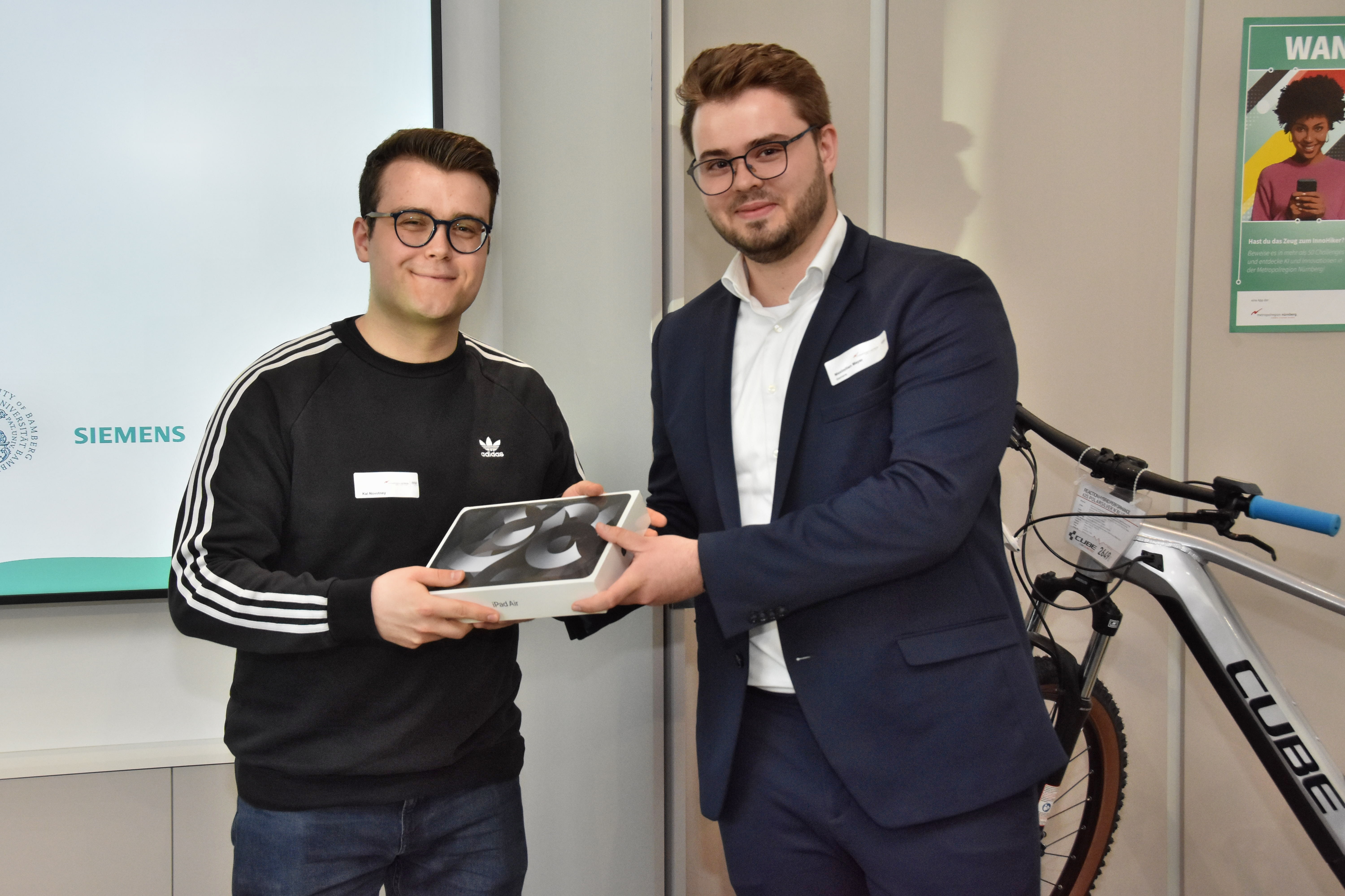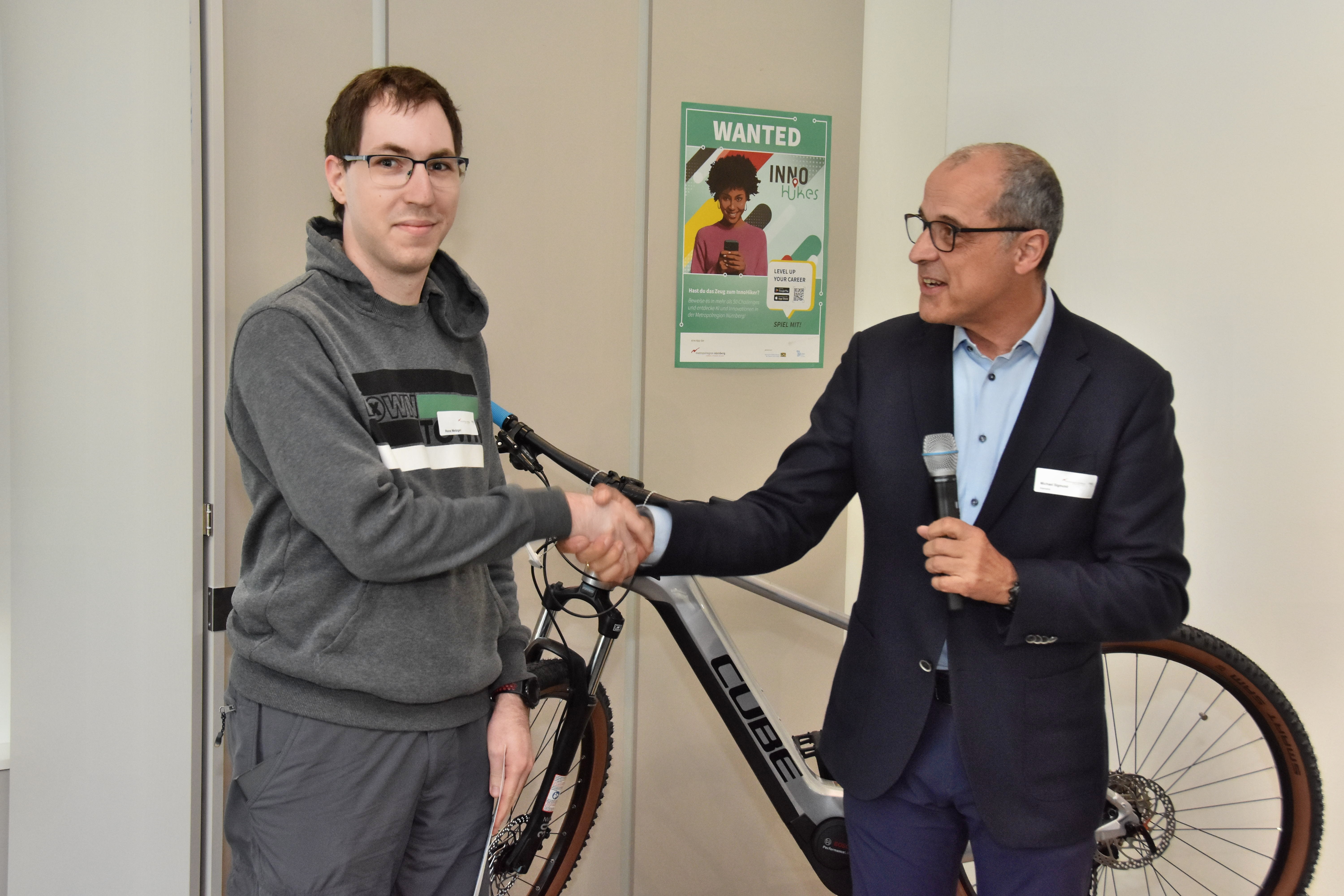 Michael Sigmund, Leiter des Siemens-Regionalreferats Erlangen-Nürnberg und stellvertretender Wirtschaftsvorsitzender der Europäische Metropolregion Nürnberg übergab den Hauptpreis, ein E-Bike von Cube. Er kennt die Stärken der Region sowie der Unternehmen, Universitäten und Forschungseinrichtungen: „Wir gehören zu den innovativsten Regionen in Europa, unsere Wirtschaftskraft ist mit der von Ungarn vergleichbar. Das alles birgt enormes Potenzial, das wir allerdings nur heben können, wenn wir den naturwissenschaftlich-technischen Nachwuchs fördern. Die InnoHikes Kampagne ermöglicht den beteiligten Partnern, jungen Menschen spannende Tätigkeitsfelder und hervorragende Karrierechancen in der Metropolregion spielerisch näher zu bringen.“