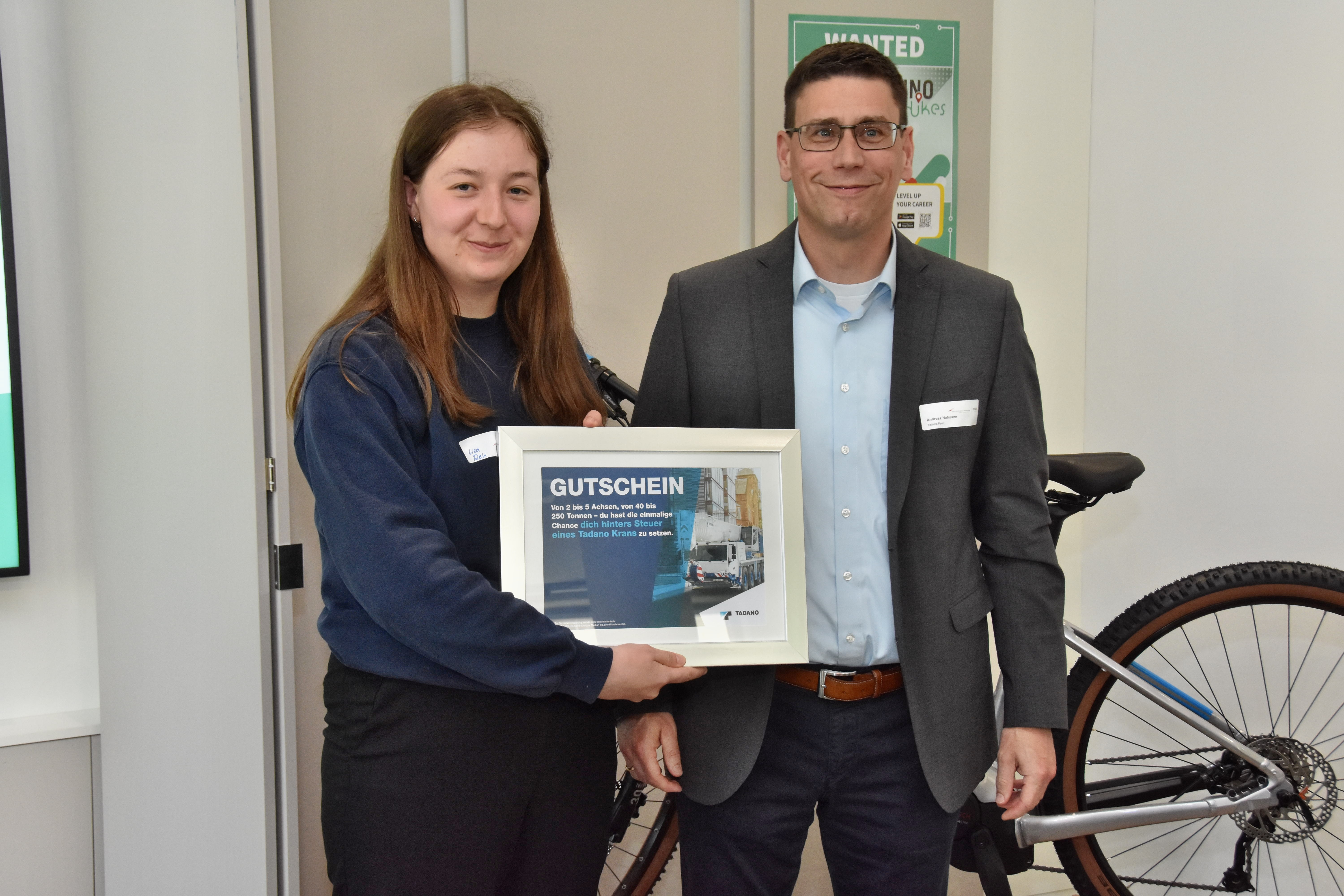 Andreas Hofmann von Tadano überreicht Gewinnerin Lisa Samira Reg einen Gutschein für eine Kranfahrt. Foto: Thomas Scherer