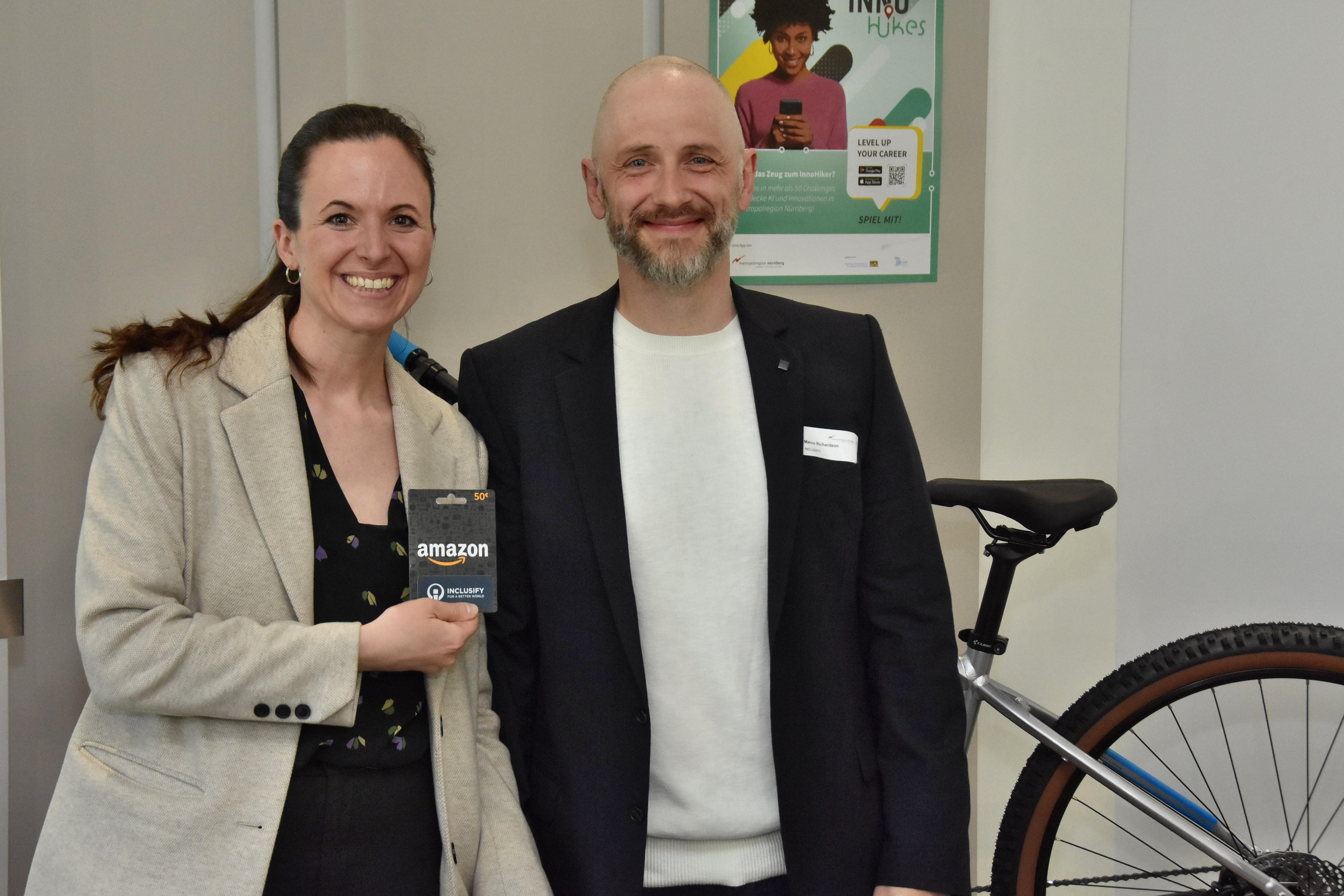 Marco Richardson von Inclusify überreicht Gewinnerin Manuela Kohl einen Online-Shop-Gutschein. Foto: Thomas Scherer