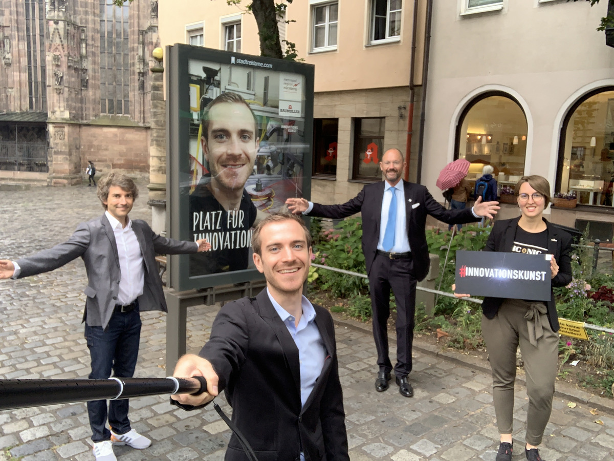 Platz für Innovationskünstler in der Nürnberger Innenstadt: v.l.n.r.: Nicolas Kubanek, Projektleiter Initiative Innovationskunst; Innovationskünstler Felix Wieser, Prozessoptimierer bei der Baumüller Gruppe; Prof. Dr. Klaus L. Wübbenhorst, Wirtschaftsvorsitzender der Europäischen Metropolregion Nürnberg; Anja Andraschko, Messe- und Onlinemarketing bei der Baumüller Gruppe