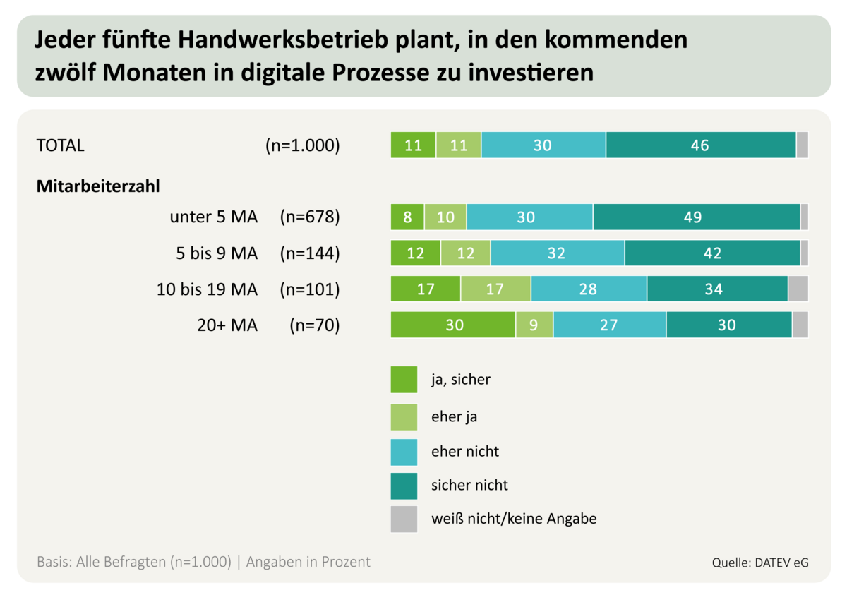 „Das Handwerk befindet sich in einer Übergangsphase, weg von einzelnen digitalen Lösungen und meist mit Papier verbundenen Medienbrüchen, hin zu durchgängig digital ablaufenden kaufmännischen Prozessen“, sagte Stefan Wunram, Chefberater Strategische Entwicklung der DATEV, bei der Vorstellung der Studie in München. Über 80 Prozent der Betriebe setzen demnach auf digitale Lösungen in der Kommunikation und den internen kaufmännischen Prozessen. „22 Prozent streben nun allerdings die nächste Stufe der Digitalisierung an“, so Wunram. In diesen Handwerksbetrieben soll in den kommenden zwölf Monaten in digitale Technik investiert werden.