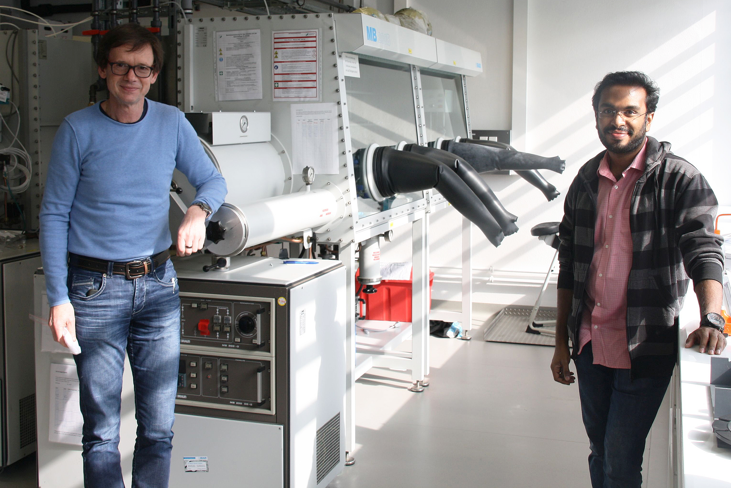 Dr. Eranezhuth Wasan Awin, Stipendiat des Bayreuth Humboldt Centres, und Dr. Günter Motz in einem Labor des Lehrstuhls Keramische Werkstoffe. Foto: UBT / C. Wißler.