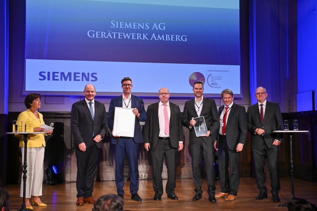 Das Siemens Gerätewerk Amberg (GWA) ist mit dem Ludwig-Erhard-Preis in Gold ausgezeichnet worden. Am Freitag, 23.Juni 2023 nahmen der Leiter GWA Matthias Kranz, Kaufmann Christian Knigge sowie der Leiter des Schwesterwerks Cham Stefan Reindl die Auszeichnung in der Kategorie „Große Unternehmen“ bei der Preisverleihung in Berlin entgegen. Die Jury würdigte das Werk für seine klare Orientierung an Kundenerwartungen, eine ausgeprägte Leistungs- und Vorbildkultur sowie die konsequente und vielfältige Einbeziehung der Mitarbeitenden und interessierten Parteien in die Strategie und deren Umsetzung. Fazit der Preisrichter: „Gerätewerk Amberg – ein Star im Siemens-Konzern leuchtet!“