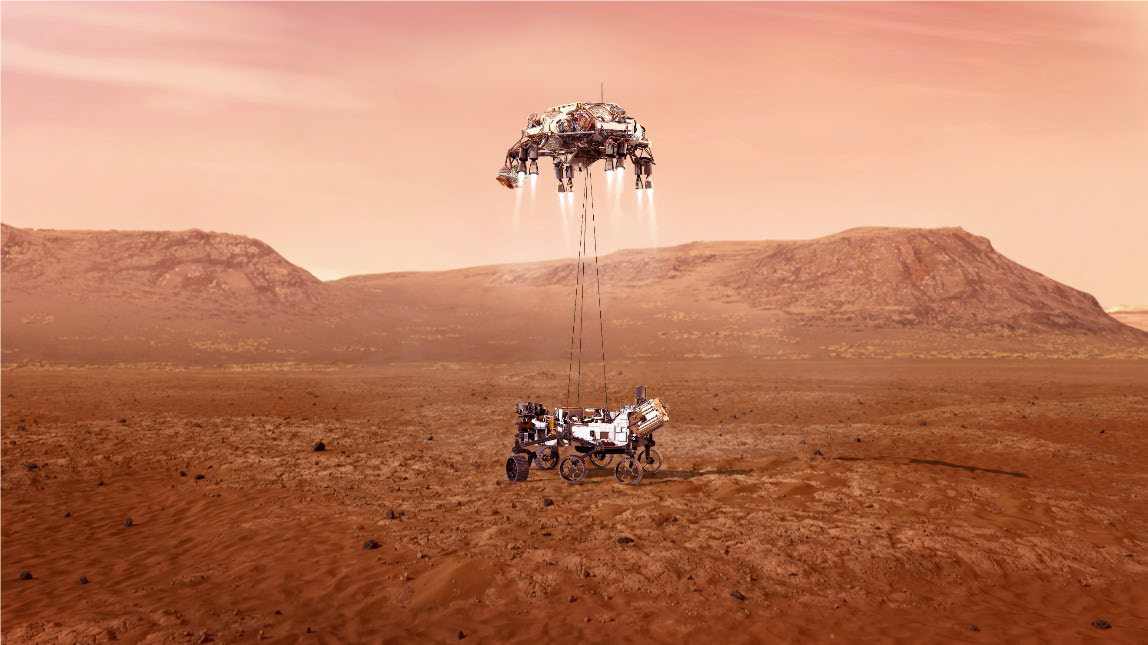 Künstlerische Darstellung der Landung des Mars-Rovers Perseverance am 18. Februar 2021 auf dem Mars im Jezero-Krater. Hauptziele der NASA-Mission MARS 2020 sind die Suche nach Anzeichen früheren Lebens sowie die Gewinnung von Gesteins- und Bodenproben für einen späteren Rücktransport zur Erde. © NASA / JPL-Caltech