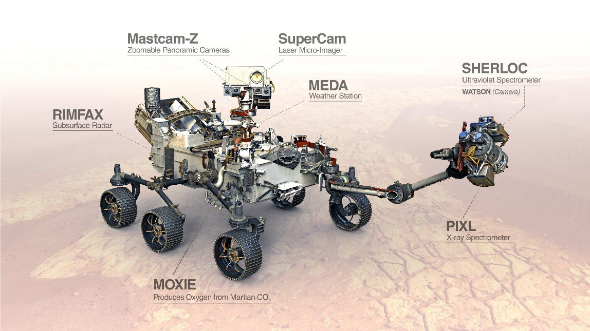 Perseverance verfügt über eine Reihe von hochmodernen wissenschaftlichen Instrumenten, unter denen ein am Roboterarm des Rovers befestigtes Deep-UV-Raman-Spektrometer eine besondere Rolle übernimmt. Das auf den Namen SHERLOC (Scanning Habitable Environments with Raman & Luminescence for Organics & Chemicals) getaufte High-Tech-Gerät ist das erste UV-Raman-Spektrometer auf dem Mars überhaupt. Es ermöglicht dort die berührungslose, räumlich aufgelöste und hochempfindliche Erkennung und Charakterisierung von organischen Stoffen und Mineralien auf der Oberfläche und im nahen Untergrund. Auf der Erde hingegen werden mit der nach dem Physiker C. V. Raman benannten Raman-Spekt-roskopie beispielsweise die Materialeigenschaften von Halbleiterkristallen untersucht.