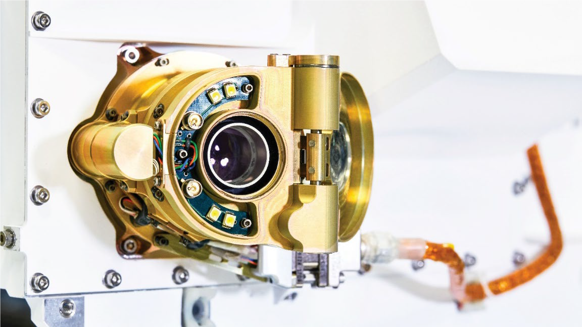 Detailaufnahme des Deep-UV-Raman-Spektrometers SHERLOC am Mars-Rover Perseverance. Das UV-Spektrometer ist unter anderem mit einer am Fraunhofer IISB in Erlangen prozessierten SiC-UV-Photodiode der Firma sglux aus Berlin bestückt. Der UV-Sensor mit TO5-Gehäuse ist links neben dem Kamera-Objektiv montiert und misst im tiefen UV-Bereich die Strahlungsleistung des Raman-Spektrometers. © NASA / JPL-Caltech