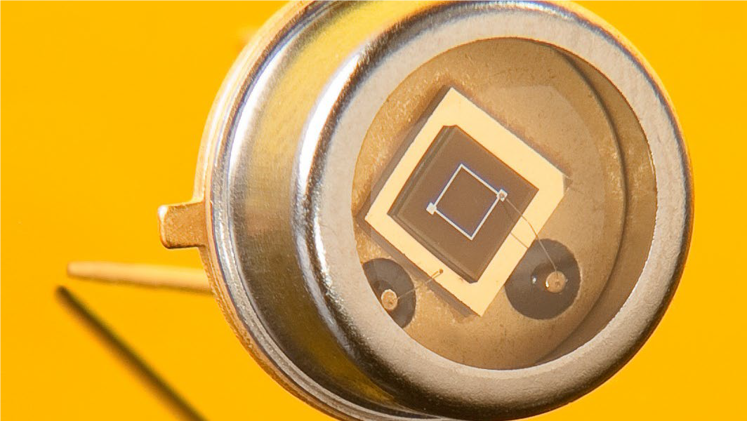 Hochzuverlässige, weltraumtaugliche und tageslichtunempfindliche Breitband-SiC-UV-Photodiode SG01XL-5 von sglux im erprobten TO5-Gehäuse. Der alterungs-beständige, rauscharme und reaktionsschnelle SiC-UV-Sensor arbeitet in einem großen Temperatur-bereich stabil. In der Mitte des Gehäuses ist der 7,6 x 7,6 mm² große Silizium-karbid-Chip zu sehen, der am Fraunhofer IISB prozessiert wurde. © sglux