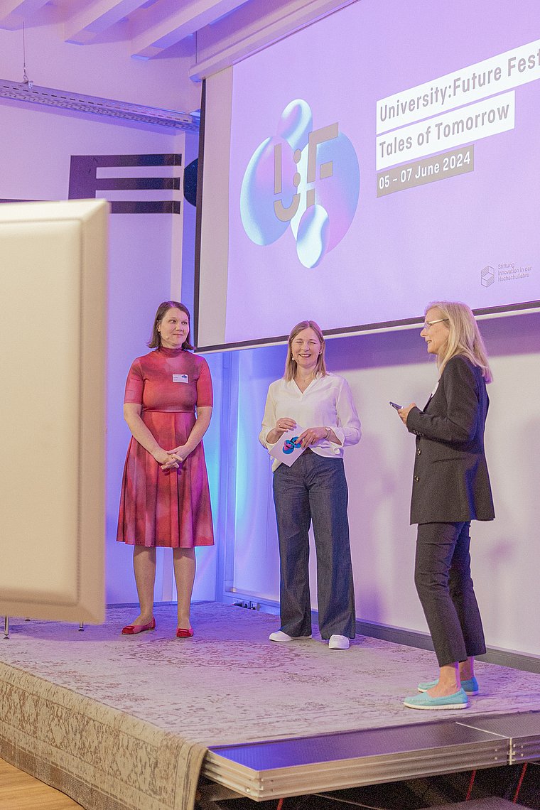 © Felix Zeiss | Prof. Dr. Christina Zitzmann, Vizepräsidentin für Bildung an der Ohm (von links), Moderatorin Martina Wolf und Prof. Dr. Isa Jahnke, Gründungsvizepräsidentin für Studium, Lehre und Internationales an der UTN, eröffneten die Nürnberger Partnerbühne des University Future Festivals.