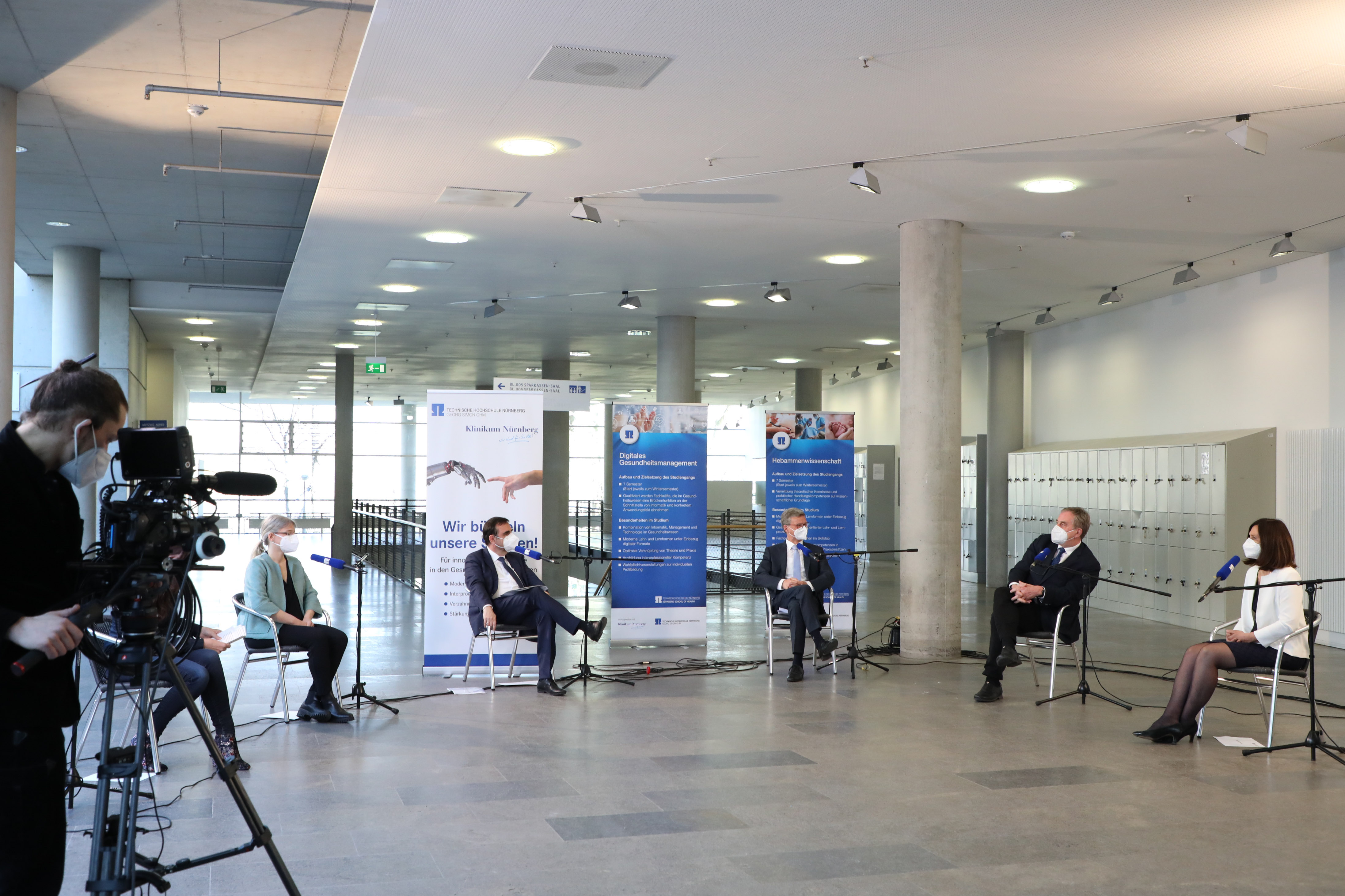 Rund 1200 Zuschauer verfolgten online, wie Ministerpräsident Dr. Markus Söder gemeinsam mit TH-Präsident Prof. Dr. Niels Oberbeck, Klinikum-Vorstand Prof. Dr. Achim Jockwig und Nürnbergs Oberbürgermeister Marcus König die Nürnberg School of Health gründete. Durch die Neugründung wird der Hightech Medizin-Standort Metropolregion Nürnberg deutlich gestärkt und bekommt neben den bereits bestehenden akademischen Einrichtungen nun in Nürnberg eine weitere innovative Bildungseinrichtung. Die Nürnberg School of Health reiht sich damit in die renommierte Liste von regionalen Medizin Hightech Akteuren wie zum Beispiel dem Medical Valley in Erlangen ein.