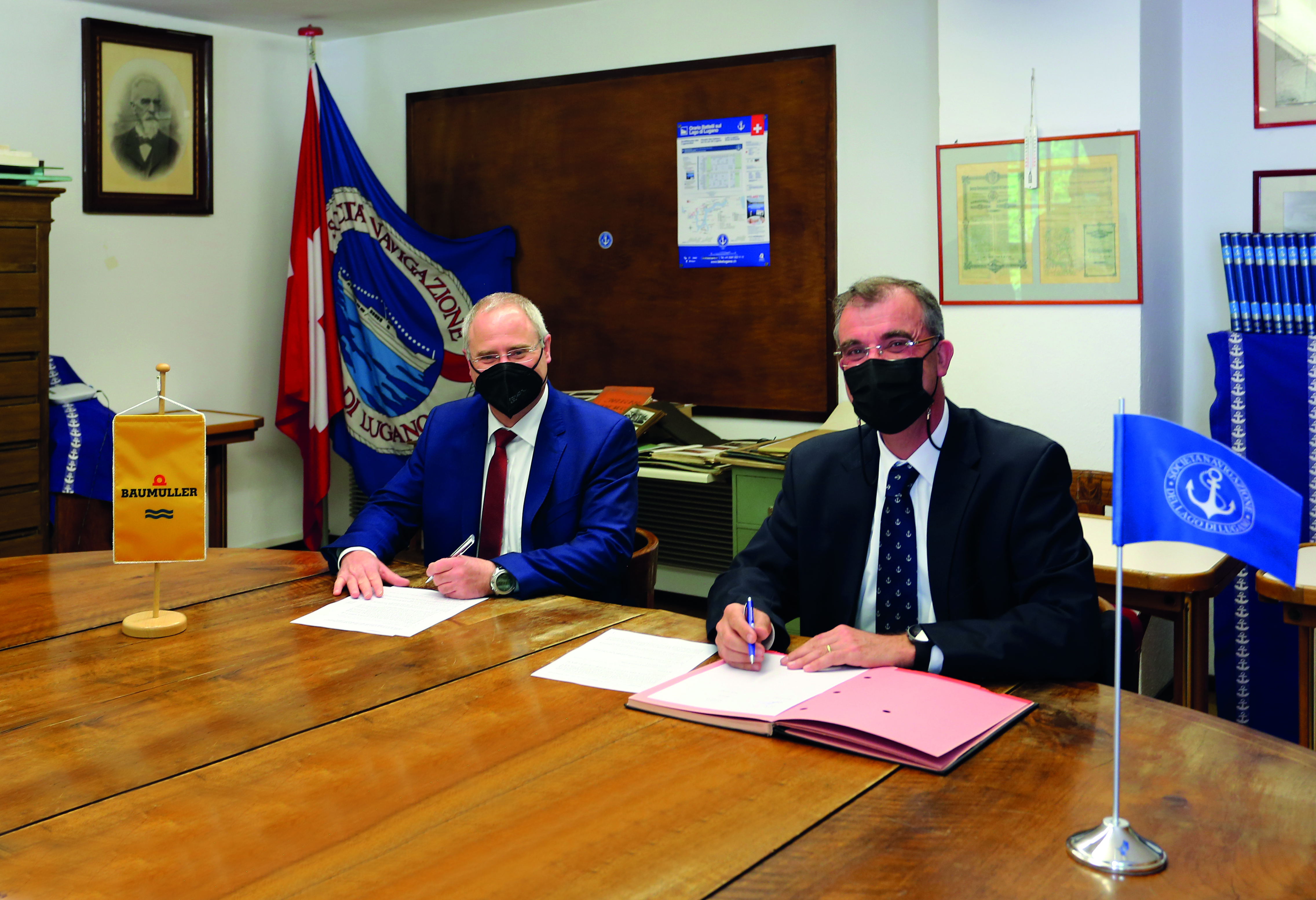 Andreas Baumüller, Geschäftsführer der Baumüller Gruppe (links) und Agostino Ferrazzini, Präsident von SNL (rechts) bei der Unterzeichnung des Kooperationsvertrags, Copyright: Società Navigazione del Lago di Lugano“