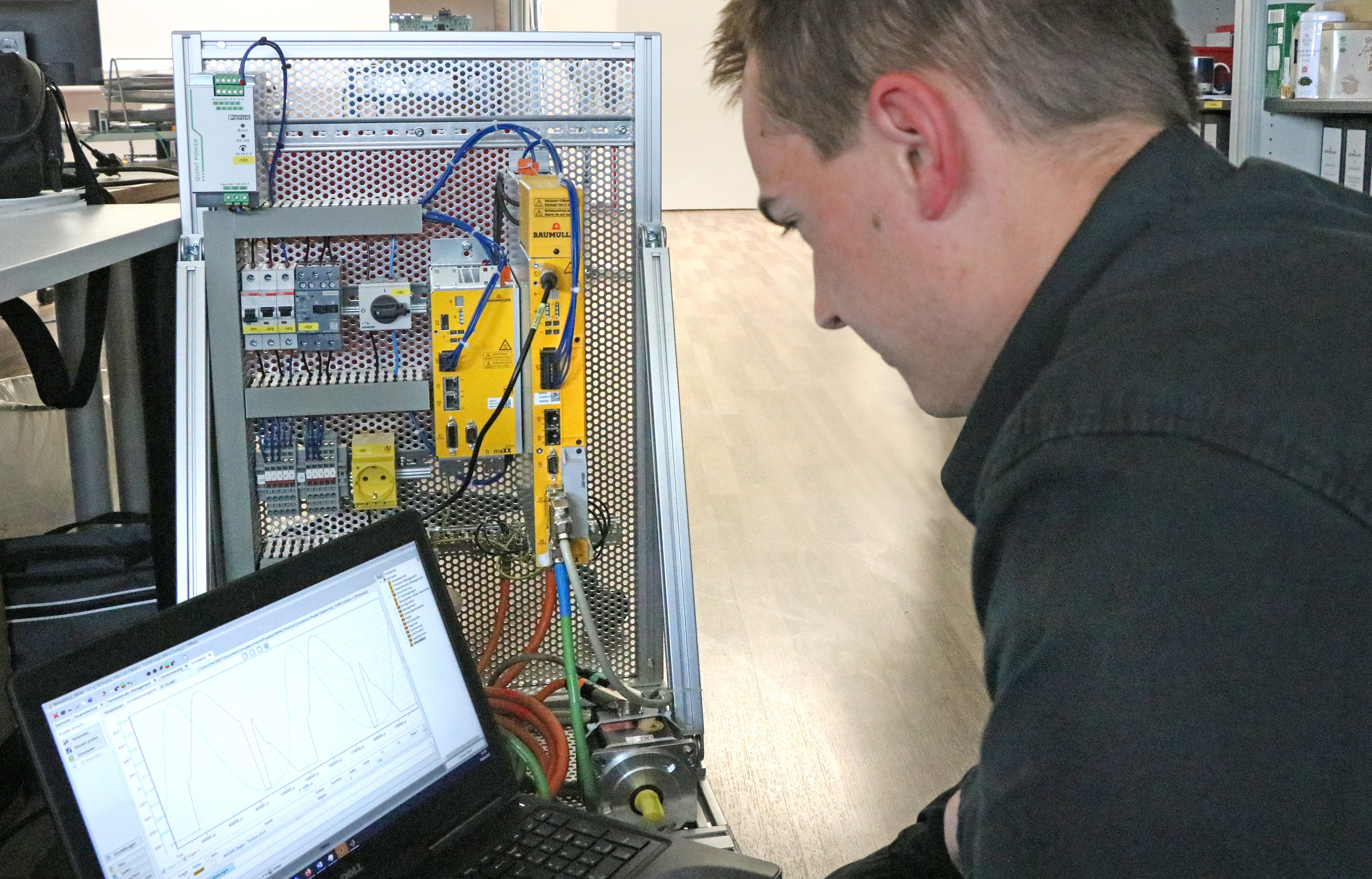 In den vergangenen Jahren wurde bei Baumüller ein Team aus klugen Köpfen aufgebaut, um auch in Zukunft mit Know-how und neuen Softwarelösungen wettbewerbsfähig zu bleiben. Der Mix aus erfahrenen und jüngeren Kollegen sorgt für eine richtig gute Arbeitsatmosphäre. Für mich absolut klasse, da ich mich so optimal weiterentwickeln kann und direkt an spannenden Projekten mitwirken kann, die für die Zukunft der Automatisierungstechnik eine entscheidende Rolle spielen werden. Die Themenbereiche Simulation und Digitaler Zwilling werden künftig immer wichtiger. Mit ihnen lassen sich Antriebsauslegungen virtuell testen und auch Energiekonzepte können optimiert werden, um die Maschine noch wirtschaftlicher zu machen.