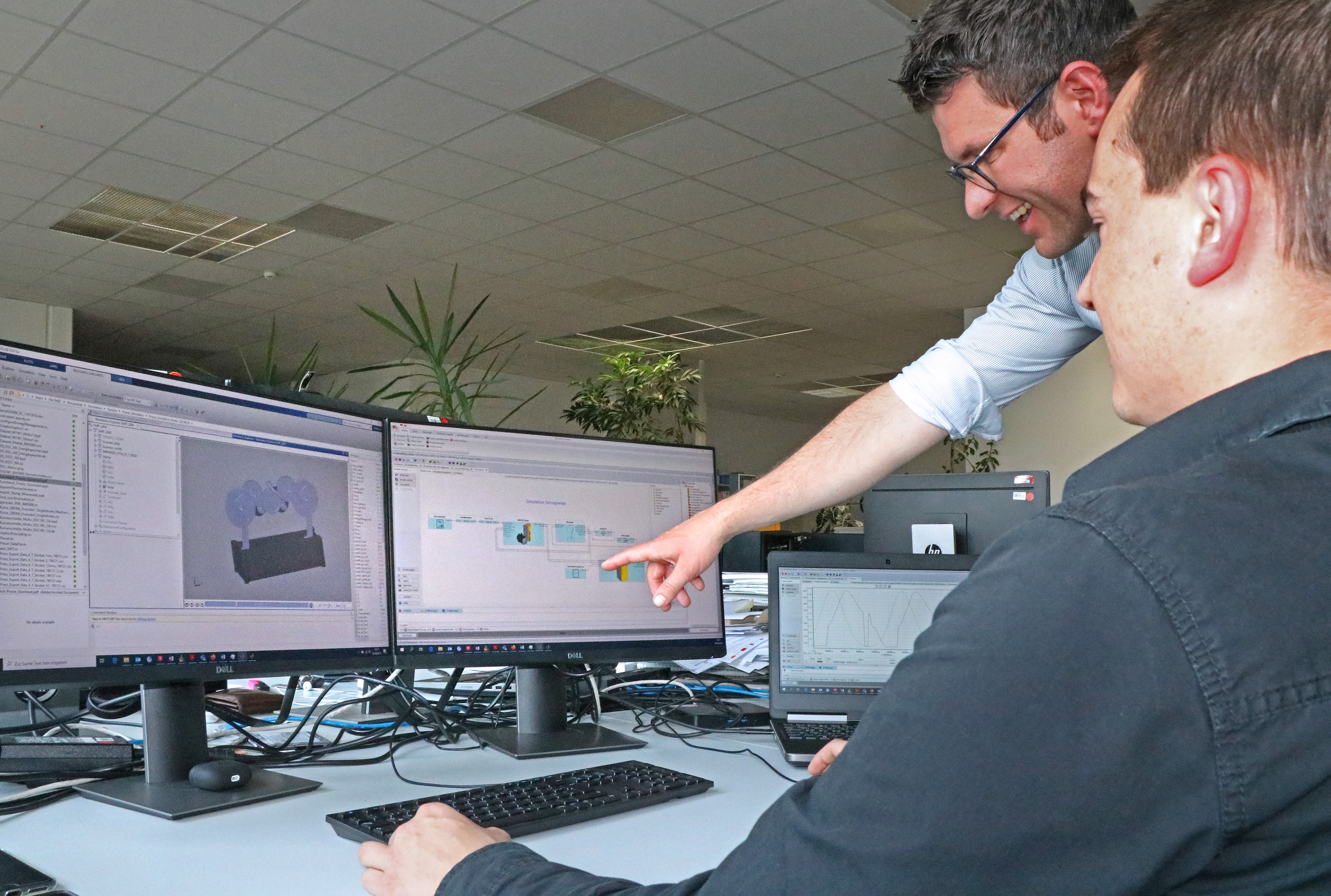 Aktuell arbeite ich an dem Modell einer Servopresse. Mit solchen Pressen werden große Bauteile aus Blech hergestellt, beispielsweise für die Automobilindustrie. Da werden Türen oder Motorhauben innerhalb von wenigen Sekunden gefertigt, die präzise und genau geformt sein müssen, weil sonst beim Montieren die Teile nicht zusammenpassen. D.h. für uns als Antriebs- und Automatisierungshersteller spielen hierbei die Themen Dynamik und Präzision eine große Rolle. Die Maschine muss ganz exakt arbeiten. Um die perfekte Antriebsauslegung und Parametrierung der Presse zu entwickeln, haben wir einen digitalen Zwilling der Servopresse erschaffen, bevor die Maschine real aufgebaut wurde. Das ist aus mehreren Gründen vorteilhaft: Zum einen spare ich dem Maschinenbauer dadurch Zeit und somit auch Geld, da die Inbetriebnahme vorab erfolgen kann. So kann ich die Maschine bereits vorab testen und optimal einstellen. Wenn meine Kollegen aus der Applikation zur Inbetriebnahme z.B. nach Asien fliegen, sind 90 Prozent der Funktionen bereits getestet und können übernommen werden. Zum anderen erschaffe ich das perfekte Abbild der Realität, quasi eine Art Maschinen-Dummy, an dem ich alle möglichen Einstellungen austesten kann. Die Simulation verhält sich ganz genauso wie eine echte Maschine!