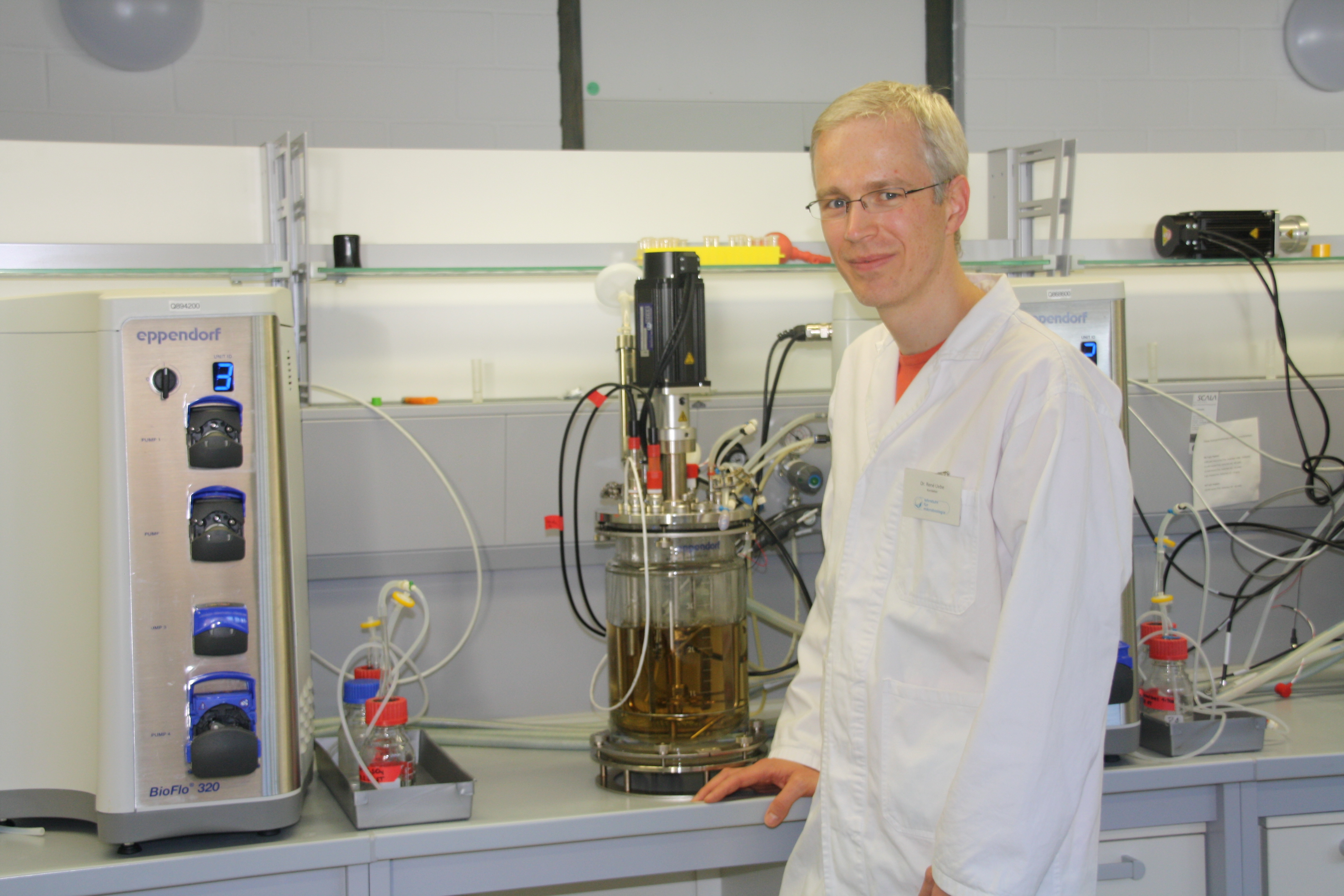 Dr. René Uebe, Bayreuth, an einer 3-Liter-Fermenter-Anlage zur Magnetbakterien-Anzucht. Foto: Christian Wißler.